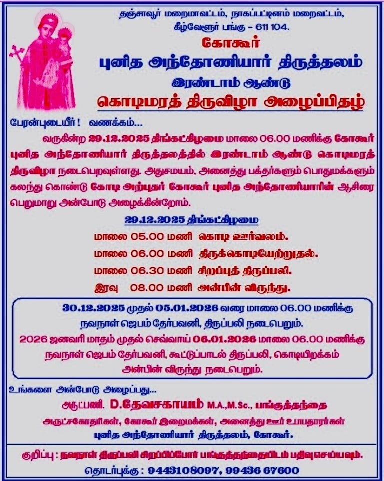 12.00 PM : தமிழ் திருப்பலி, அதைத் தொடர்ந்து இறைமக்களுக்கு அன்பின் விருந்து வழங்கப்படும்